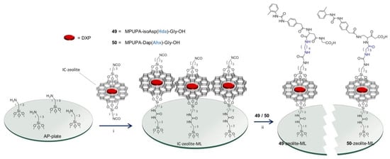 For the presence of functionalized side chains, which can be equipped with taggable or linkable side chains, 12 and 13 were selected for the preparation of biomaterials. To the purpose, the peptides were modified by introducing suitable linkers, giving MPUPA-(S)-isoAsp(Hda)-Gly-OH (49) and MPUPA-(S)-Dap(Ahx)-Gly-OH (50), respectively (Scheme 9 and Scheme 10). Thereafter, the monolayers 49–zeolite ML and 50–zeolite MLs were expediently prepared by stably anchoring the peptides onto MLs of zeolite L crystals mounted over silica plates (Scheme 10).