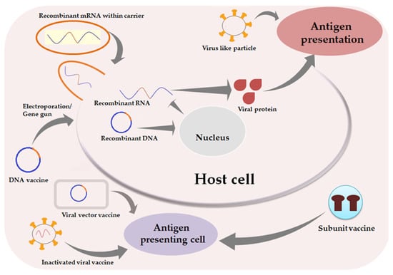 DNA vaccines can deliver CoV genes to the human cells mostly through recombinant plasmid DNA. The plasmid contains a mammalian promoter along with a transgene sequence encoding the desired antigen, S protein in this case. The principle relies on DNA translocation within the nucleus of the cell. In the nucleus, using the host cell machinery antigenic proteins are expressed by the delivered viral genetic material. Thus, they are much safer than a live attenuated virus or inactivated virus regarding chances of pathogenicity. Moreover, these vaccines use human cells as production houses to increase the antigenic load, thus decreasing individual dose requirements. Antigen-presenting cells can be transfected directly with the delivered genetic material. Expressed antigens are loaded onto MHC I and MHC II molecules due to the cross priming potential [26]. The antigens are either released by exosomes or apoptotic bodies which lead to recognition by antigen presenting cells, and further evolution of humoral or cytotoxic immune responses. However, a low risk of viral mutation still coexists by integration of transfected DNA with host somatic DNA, leading to irregularities in genetic expressions.