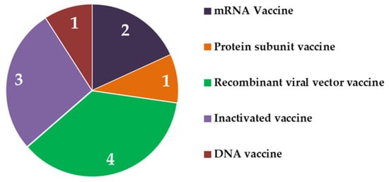 Distribution of approved vaccines based on vaccine types. Recombinant viral vector vaccines dominate the list followed by inactivated vaccines, mRNA vaccines, protein subunit vaccine and DNA vaccine.