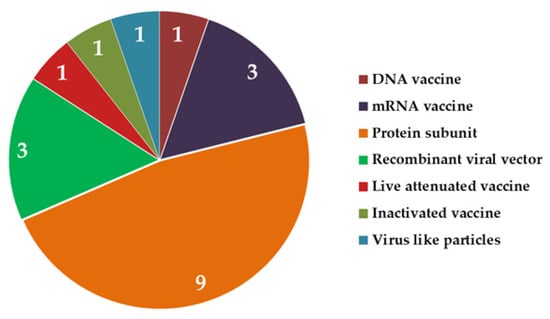 Subunit vaccines are made up of either synthetic peptides or recombinant proteins responsible for eliciting immunogenicity. Since these vaccines consist of only certain immunogenic fragments instead of the whole viruses, they are quite efficacious as well as safer. Further, small defined peptide fragments are easy to scale up and pose fewer risks of side effects. As already mentioned, a number of structural proteins, such as S, E, M, and N, expressed by SARS-CoV-2, may act as antigens to activate the immune response. Generally, either booster doses or co-administration of suitable adjuvants is required along with peptide subunits to elicit an immunogenic response to the desired level. Currently, the highest number of vaccine candidates against SARS-CoV-2 is using this strategy [31].