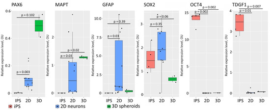- Mariani, J.; Simonini, M.V.; Palejev, D.; Tomasini, L.; Coppola, G.; Szekely, A.M.; Horvath, T.L.; Vaccarino, F.M. Modeling human cortical development in vitro using induced pluripotent stem cells. Proc. Natl. Acad. Sci. USA 2012, 109, 12770–12775. [Google Scholar] [CrossRef] [Green Version]