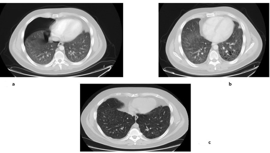 In these pictures, the response obtained with imatinib in Patient n.1 is reported: (a) Computed tomography of the chest shows the basal condition of the patient with pneumothorax; (b) Improvement after one year of treatment; (c) Maintained response ten years later.
