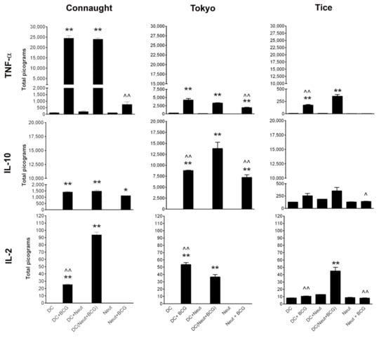 A comparison was made of the three strains on murine DC and neutrophils at a multiplicity of infection (MOI) of one cell to five bacteria (1:5) [36]. Immune cells were exposed to BCG for 2 h, followed with BCG being removed and cytokine production (TNFα, IL-10 and IL-2) was measured 16 h later, Figure 1. TNFα is an inflammatory cytokine, IL10 is anti-inflammatory and IL2 is a cytokine that stimulates lymphocyte. Thus, evaluating these three cytokines provides a view of the immunostimulatory capacity of the DC and neutrophils stimulated with BCG.