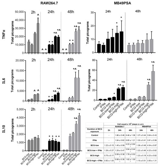 MB49PSA murine bladder cancer cell-line (grown in complete DMEM) and RAW264.7 murine macrophages cell-line (ATCC catalogue number TIB-71, RRID: CVCL_0493) (grown in complete DMEM supplemented with 1 mM sodium pyruvate) were plated at 2.5 × 105 cells/well one day before treatment. Cells were exposed to BCG singly or in combination with 1 ng/mL recombinant IFNα (Biolegend, San Diego, CA, USA). BCG doses were set at MOI 1:1 or 1:5 for RAW264.7 and MOI 1:4 or 1:40 for MB49PSA to evaluate the effects of low and high dose BCG. After being exposed to BCG for 24 or 48 h, IL-6, TNFα and IL-10 were measured in the supernatant by ELISA (Thermo Fisher Scientific, Waltham, MA, USA) and cell proliferation was measured by enumerating cells after trypan blue staining. RAW264.7 were treated with BCG for 2 h as well. BCG containing media were removed, and the remaining BCG was killed as described above, and cells were further incubated with fresh media for 24 h.