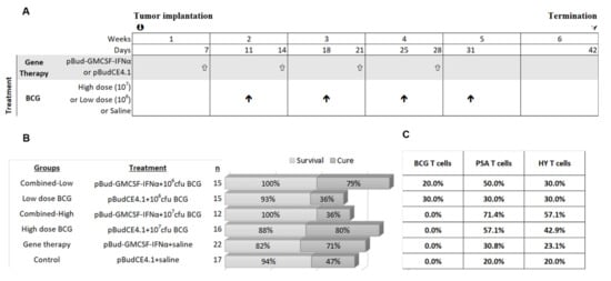 The schedule and outcome of 4 instillations of gene therapy and high and low dose BCG. (A) The experimental plan and schedule of instillations are shown as well as experimental groups. (B) The outcome of the short-term study, in terms of cure rate and survival, where the cure rate was determined by real-time PCR for the presence of the marker gene PSA. (C) The percentage of mice with antigen specific T cells recognizing BCG, PSA and HY in each therapy group are shown.