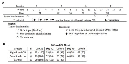 High dose BCG Tokyo (1 × 107 cfu/0.1 mL), low dose BCG Tokyo (1 × 106 cfu/0.1 mL) and these doses combined with pBud-GMCSF-IFNα gene therapy were evaluated using the therapeutic schedule shown in Figure 3. There were six groups in total: control, high dose BCG; low dose BCG; cytokine gene therapy; combined-high dose BCG (cytokine gene therapy combined with high dose BCG) and combined-low dose BCG. Therapy commenced seven days after orthotopic tumor implantation in mice. Gene therapy was administered three days prior to BCG as this was previously shown to improve response to BCG [31]. Weekly urinary PSA was monitored until day 42. The cure rate, Figure 3, for combined-low dose BCG was 79%, while it was 36% for low dose BCG alone. For high dose BCG, the cure rate was 80% but for the combined-high dose BCG, the cure rate was only 36%. The spontaneous cure rate in control mice was 47%. Thus, high dose BCG alone or combined-low dose BCG achieved similarly high cure rates of 30% more than the spontaneous cure rate, Figure 3.