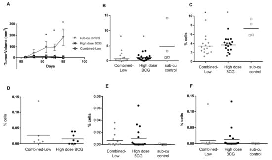The immune populations in the spleen were analyzed and both the treated groups had lower CD4+ICOS+ T cell and NK cells in their spleens than tumor bearing age matched mice, as shown in Figure 5B,C. The reduction of immune cell types in the spleen are likely due to exit of these cells from the spleen and movement to the site of the tumor. This may be indicative of increased systemic circulation of these cells as previously observed in mice [39]. Macrophages, neutrophils and CD8+ICOS+ T cells were present in similar numbers between all groups (data not shown). CD8+ antigen specific T cells were monitored using pentamers recognizing the HY, PSA and BCG antigens (Figure 5D–F) and Figure S2. Approximately 6/7 of the combined-low dose BCG treated mice and 5/8 of the high dose BCG treated mice had BCG specific T cells. PSA specific T cells were found in 5/15 and 7/18 of the mice treated with combined-low dose BCG and high dose BCG respectively. Finally, 3/15 and 6/17 of the mice treated with combined-low dose and high dose BCG were positive for HY antigen recognizing T cells. In the combination group 2/15 (13.3%) mice had antigens to both PSA and HY while for the high dose group 4/18 (22.2%) of mice had T cells to both antigens. In the age matched control group, no mice (0/3) had antigen specific T cells. Three mice from the high dose group and one mouse in the combined-low dose group had T cells that recognized all three antigens. T cells recognizing at least one tumor antigen were found in 9/18 of the high dose group and 6/15 of the combined-low dose group (15). The pentamer assay was limited to the antigens for which pentamers were available and there may have been T cells generated against other tumor antigens.