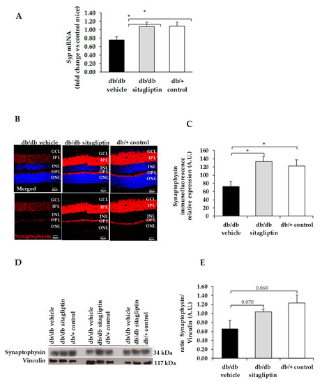 (A) Real-time quantitative RT-PCR analysis of synaptophysin gene (Syp) in db/db mice treated with vehicle (black bars), sitagliptin eye drops (grey bars), and in non-diabetic mice (white bars). (B) Immunofluorescence of synaptophysin (red) among representative samples of diabetic retinas of experimental groups. Hoechst staining (blue) was used for nuclei labeling. ONL: outer nuclear layer; OPL: outer plexifom layer; INL: inner nuclear layer; IPL: inner plexiform layer; GCL: ganglion cell layer. Scale bars, 20 µm. (C) Quantification of synaptophysin immunofluoresence in diabetic mice treated with vehicle eye drops (black bars), sitagliptin eye drops (grey bars), and in non-diabetic retinas (white bars). (D) Western blot bands of synaptophysin and (E) Densitometric analysis in db/db mice treated with vehicle eye drops (black bars), sitagliptin eye drops (grey bars), and in non-diabetic mice retinas (white bars). Protein levels were normalized with vinculin. * p < 0.05.
