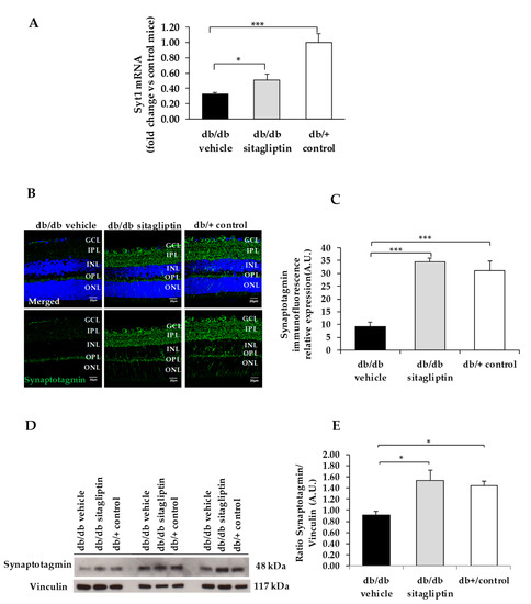 (A) Real-time quantitative RT-PCR analysis of synaptotagmin gene (Syt1) in db/db mice treated with vehicle (black bars), sitagliptin eye drops (grey bars), and in non-diabetic mice (white bars). (B) Immunofluorescence of synaptotagmin (green) among representative samples of diabetic retinas of experimental groups. Hoechst staining (blue) was used for nuclei labeling. ONL: outer nuclear layer; OPL: outer plexifom layer; INL: inner nuclear layer; IPL: inner plexiform layer; GCL: ganglion cell layer. Scale bars, 20 µm. (C) Quantification of synaptotagmin immunofluoresence in diabetic mice treated with vehicle eye drops (black bars), sitagliptin eye drops (grey bars), and in non-diabetic retinas (white bars). (D) Western blot bands of synaptotagmin, and (E) Densitometric analysis in db/db mice treated with vehicle eye drops (black bars), sitagliptin eye drops (grey bars), and in non-diabetic mice retinas (white bars). Protein levels were normalized with vinculin. * p < 0.05, *** p < 0.001.