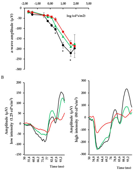 (A) Quantitative analyses of a wave amplitude in db/db mice treated with vehicle (red), db/db mice treated with sitagliptin (green), and non-diabetic mice (black). * p < 0.05 vs. db/db mice treated with vehicle. (B) Electroretinogram traces in response to low and high stimulus intensities in a representative non-diabetic mouse (black), a db/db mouse treated with vehicle (red), and a db/db mouse treated with sitagliptin (green).