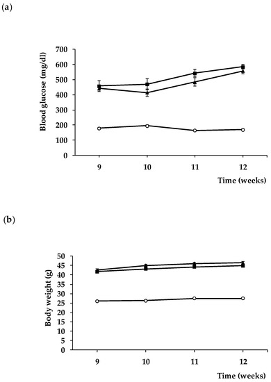 Evolution of blood glucose (a) and body weight (b) in db/+ mice (white circles), db/db mice treated with vehicle (black squares), and db/db mice treated with sitagliptin eye drops (black triangles).