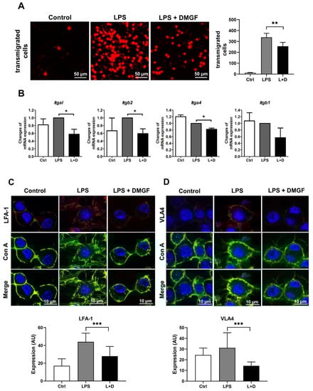 DMGF inhibited LPS-induced migration of inflammatory cells. (A) DMGF inhibited migration of LPS-stimulated macrophages. Transmigrated cells were fixed, stained and imaged by an inverted light microscope at 100× magnification. The scale bar in each picture represents 50 μm. (B) DMGF inhibited the gene expression of integrins related to adhesion molecules. All values were expressed as the mean ± SD. *—p < 0.05; **—p < 0.01; ***—p < 0.001, compared to the LPS group. (C,D) DMGF suppressed the expression of LFA-1 and VLA4 on the cell surface. LFA-1 or VLA 4 expression was stained with fluorescent dye-conjugated antibody, shown in red. The cell membrane was stained with Con A conjugated with Alexa Fluor 488, shown in green. The nucleus was stained with DAPI, shown in blue. Con A—Concanavalin A; Ctrl—Control. The scale bar in each picture represents 10 μm.
