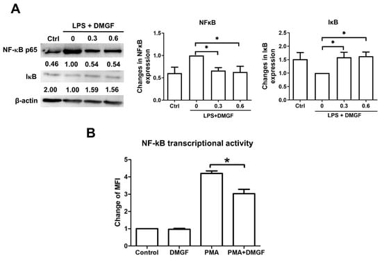 NF-κB is an essential transcriptional factor for inflammation. DMGF dramatically downregulated LPS-induced NF-κB expression and upregulated IκB expression (Figure 4A). Additionally, the results of the NF-κB-GFP transcriptional reporter assay also showed that DMGF suppressed NF-κB transcriptional activity (Figure 4B).