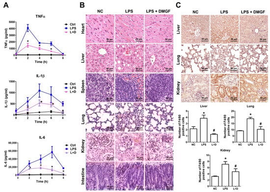 DMGF effectively reduced production of pro-inflammatory cytokines and organ damage in endotoxic mice. (A) DMGF reduced levels of TNFα, IL-1β, and IL-6 in sera. BALB/c mice received DMGF or vehicle (1% DMSO in PBS) by i.v. injection immediately after i.p. injection with LPS. Serum samples were collected and the levels of TNFα, IL-1β, and IL-6 were determined by ELISA. *—p < 0.05; compared to the LPS group. (B) Histopathological features of organs in different treatment groups. Organ sections were stained with H&E and imaged at 400× magnification. The scale bar in each picture represents 50 μm. (C) Infiltrating macrophage expression in the liver, lung, and kidney. Macrophages were stained with anti-mouse F4-80 antibody and imaged at 400× magnification. The average number of infiltrating macrophages was counted from ten random fields each slide. *—p < 0.05, compared to the NC group. #—p < 0.05, compared to the LPS group.