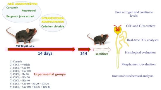 Cirmi S, Maugeri A, Micali A, Marini HR, Puzzolo D, Santoro G, Freni J, Squadrito F, Irrera N, Pallio G, et al. Cadmium-Induced Kidney Injury in Mice Is Counteracted by a Flavonoid-Rich Extract of Bergamot Juice, Alone or in Association with Curcumin and Resveratrol, via the Enhancement of Different Defense Mechanisms. Biomedicines. 2021; 9(12):1797. https://doi.org/10.3390/biomedicines9121797