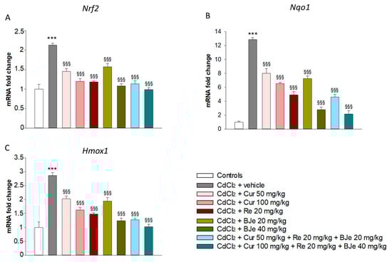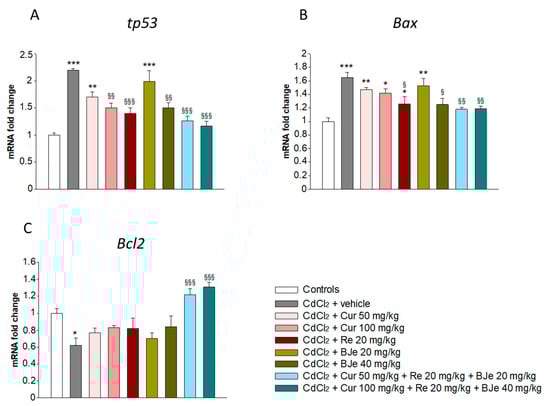 | CdCl2 + Cur 100 mg/kg + Re 20 mg/kg + BJe 40 mg/kg | 64 ± 5 b | 34.1 ± 1.1 b |