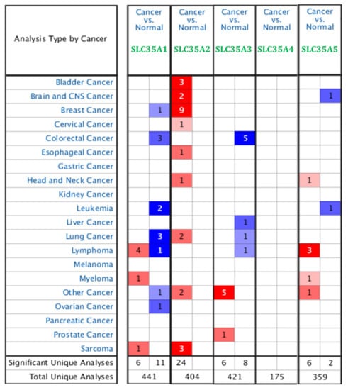 Pan-cancer analysis and overview of mRNA expression levels of solute carrier 35A (SLC35A) family genes in 20 common types and subtypes of cancer from the Oncomine platform database. Dysregulation of each individual SLC35A gene in targeted cancer tissues measured by mRNA expression levels was compared to their normal counterparts using Student’s t-test. The cutoff of parameters were restricted as follows: p < 0.05; fold change of >2; gene rank: top 10%. The number of datasets that met those thresholds is presented as a number inside the table cells while the colors indicate the trend of gene expression (red for up-regulation and blue for down-regualtion, respectively), and the intensity of the colors indicates the degree of abnormal expression.