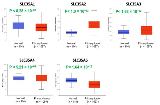 Expression profiles of all five members of the SLC35A family were then determined using the UALCAN database (Figure 2). mRNA levels of SLC35A2 and SLC35A3 were considerably overexpressed in BRCA tissues. SLC35A5 transcript levels were down-regulated relative to healthy controls, while SLC35A1, SLC35A4, and SLC35A3 transcript levels exhibited non-significant differences.