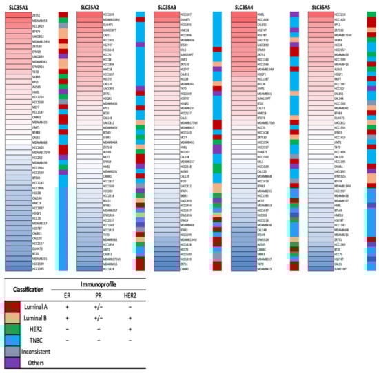To gain better insights in molecular landscape of SLC35A family genes, genomic data, analysis, and visualization of 947 human breast cancer cell lines were acquired from The CCLE database [30]. Using a log2 transformation of expression values, expression levels of each individual were exported and shown as a heatmap.