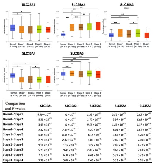 Solute carrier 35 A (SLC35A) transcription profiles in four stages of BRCA (UALCAN database). In the TCGA dataset, there were 114 normal samples, 183 patients at stage 1, 615 patients at stage 2, 247 patients at stage 3, and 20 patients at stage 4. Boxplots show relative expression levels of SLC35A family genes in healthy controls and stages 1, 2, 3, and 4 of breast cancer. Figure depicts expressions of SLC35A family genes (SLC35A1–SLC35A5) in breast cancer patients at individual cancer stages. Student’s t-test was conducted for statistical tests between groups. (* p < 0.05, ** p < 0.01, *** p < 0.001).