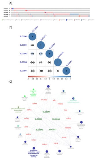 Co-expression analysis and genetic alterations in solute carrier 35A (SLC35A) family members (cBioPortal) (Cytoscape). (A) Alterations in SLC35As in TCGA Pan-Cancer Atlas (n = 1082), are summarized. Gene amplification is represented by red bars, deep deletions by blue bars, and missense mutations by green bars. This graph demonstrates that SLC35A2 (8%) and SLC35A4 (12%) have substantial rates of mutation. (B) Using the TCGA Pan-Cancer Atlas dataset (n = 1082), correlations among SLC35A family members in breast cancer were assessed. The “corrplot” R package was used to build the symmetrical correlation matrix. Color of Spearman’s rank correlation coefficients (rho) indicate the degree of pairwise correlations (rho). A positive correlation is indicated by a darker blue tone and a larger dot size, whereas a negative correlation is indicated by a darker red color and a smaller dot size. Non-significant correlation coefficient values (p > 0.01) are represented by a cross symbol. (C) A network of connected genes and pathways was created. For each SLC35A member, top 20% of co-expressed genes were shorlisted from the METABRIC database (approximately 4000 genes) then being merged prior to being intersected with a list of 21 common genes. Final result gene list was input to ClueGo of Cytosape. Only pathways which p-value of 0.05 are revealed since Bonferroni correction of the p-value were applied to account for statistical option of a two-sided hypergeometric test for enrichment.