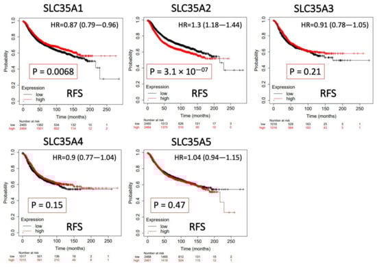 Significant correlations between mRNA levels of solute carrier 35A (SLC35A) family members and the recurrence-free survival (RFS) curve of patients diagnosed with breast cancer (BCRA). The two survival curves respectively illustrate survival outcomes (including survival percentages and survival times) of BRCA patients with high (red) or low expression (black) levels of SLC35A family members. Increased mRNA levels of SCL35A2 resulted in a poor prognosis, while increasing levels of the remaining members were associated with favorable outcomes. SLC35A3, SLC35A4, and SLC35A5 were not statistically significant (p < 0.05).