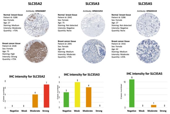 The Human Protein Atlas (HPA) platform, which comprises more than 10 million IHC images and 400,000 high-resolution immunofluorescences (IF) images of tissue microarrays, was used to determine SLC35A family protein expressions. These microarrays, which are tagged with over 700 antibodies against human proteins, correspond to 20 different types of human cancer [38]. We used BRCA data resources to gather 1075 patient samples and analyzed protein expressions in clinical samples through IHC images. For each cell line and antibody, the staining intensity, subcellular localization, and single-cell variability (SCV) are provided. Depending on the laser capacity and detector gain settings used for image capture, as well as the discernible appearance, the staining intensity is characterized as strong, moderate, weak, or negative. Manual staining intensity assessment of IHC data (strong, moderate, weak, or negative) and the proportion of stained cells (>75%, 25–75%, or 25%) were used to determine protein expression scores.