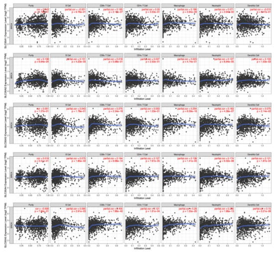 Correlations between solute carrier 35A (SLC35A) family member expressions and immune infiltration profiles of BRCA performed in the TIMER database. The graph shows above respectively depicts the correlations between abnormally expressed gene of SLC35A family and levels of some remarkable tumor-infiltrating immune cell markers, including the lymphoid lineage (B cells, CD4+ T cells, and CD8+ T cells), followed by the myeloid lineage (neutrophils, macrophages, and dendritic cells) (p < 0.05).