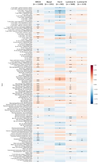 Solute carrier 35A (SLC35A2) expressions and immune infiltration in several BRCA subtypes are depicted in a heatmap. The plot shows correlations between BRCA subtypes (luminal A, luminal B, HER2, and basal) while six cutting-edge algorithms (including quanTIseq, CIBERSORT, MCP-counter, EPIC, xCell, and TIMER) were used to determine the number of samples from 112 immunological infiltrates. The R-scores varied from −1.0 to 1.0. While r = 1 represents perfect positive correlation, a perfect negative correlation is represented by r = −1 (* p < 0.05, ** p < 0.01, *** p < 0.001).
