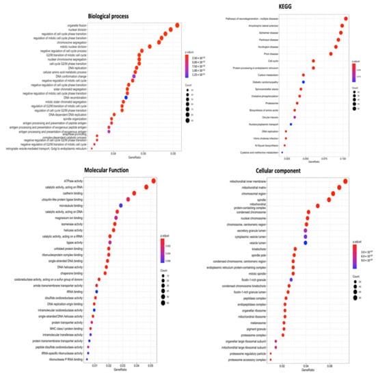 Gene ontology (GO) keywords with gene p values (cellular components, biological processes, molecular functions, and KEGG ontology). Number of genes counted in each function is represented by the size of the circles, and the colors of the bubbles correlate with p values.