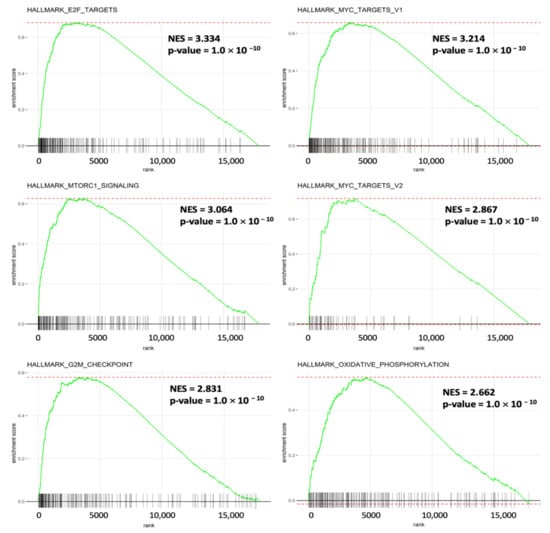 It was fascinating to learn more about the molecular mechanisms driving gene sets that are co-expressed with SLC35A2. Enrichment of MSigDB Hallmark gene sets in BRCA samples with high SLC35A2 expression levels was investigated using a GSEA. Interestingly, E2F—targeted pathways, a factor that plays essential roles for cell proliferation control, had the highest NES (of 3.34). Recent research revealed additional roles for this pathway, particularly E2F transcription factors, in tumor progression, angiogenesis, and metastasis. Independent of clinical parameters, specific E2Fs have prognostic value in BRCA. We also discovered that inflammation and immune-related gene sets of MYC target V1, MTORC1 signaling, and MYC target V2 were enriched with high SLC35A2 expression in BRCA. Furthermore, SLC35A2 was shown to be highly expressed in a group of cancer-related genes, including the G2M checkpoint and oxidative phosphorylation (Figure 11). Supplementary Figure S1 shows the detailed enrichment results.