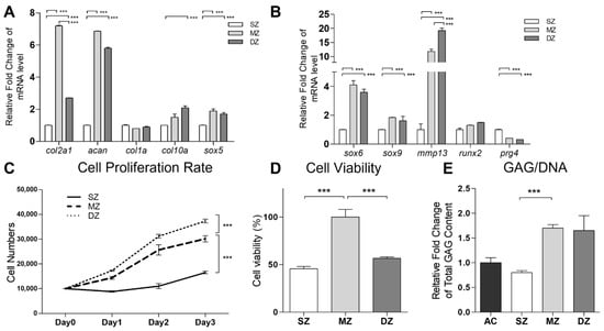 Functional properties of separation of superficial zone (SZ), middle zone (MZ), and deep zone (DZ) of chondrocytes. The porcine articular chondrocytes by discontinuous Percoll gradient. (A,B) The mRNAs of col2a1, Acan, col1a1, col10a1, sox5, sox6, sox9, mmp13, runx2, prg4, and gapdh among SZ, MZ, and DZ of chondrocytes were analyzed by real time PCR. The modulation of mRNA expression was expressed relative to the SZ after normalization to the gapdh signal. (C) Cell proliferation rates of SZ, MZ, and DZ of chondrocytes were determined by counting the cell numbers for 3 days. (D) The SZ, MZ, and DZ of chondrocytes were cultured in the monolayer for 72 h. The cell viability was then detected using an MTT assay. (E) Total glycosaminoglycan (GAG) content was measured in monolayer culture. (***, p < 0.001).