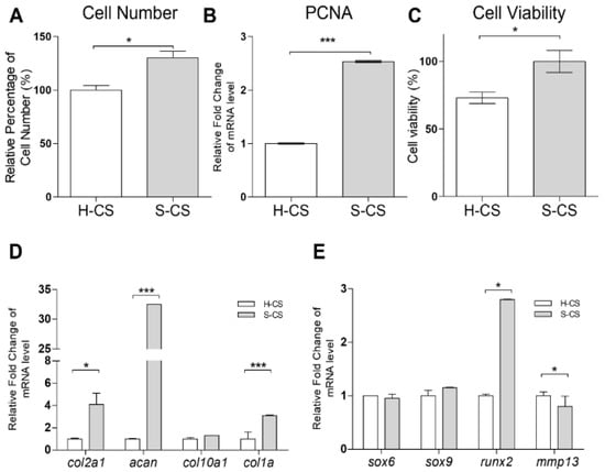 After 3 weeks of culturing in vitro, the cells were harvested and counted. The mean number of cells in the S-CS (range, 1.36–1.46 × 106) was significantly higher than that in the H-CS (range, 0.89–0.95 × 106) (Figure 2A). Additionally, the transcriptional analysis of proliferating cell nuclear antigen (pcna) showed a 2.5-fold increase in the expression of the antigen in the S-CS compared with that in the H-CS (Figure 2B). An MTT assay also showed a slight increase in the average live cell percentage in the S-CS (Figure 2C). Comparing the cartilage-formation capacities, the mRNA expression of col2a1 and acan in the S-CS (S-CS vs. H-CS, col2a1, 4.8-fold; acan, 30-fold) increased significantly. Conversely, the mRNA expression of mmp13 showed a more significant decrease in the S-CS than in the H-CS (S-CS vs. H-CS, mmp13, 0.8-fold) (Figure 2D,E).