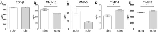 Comparison of the concentrations of humoral factors secreted by heterogeneous chondrocyte sheets (H-CS) and stratified chondrocyte sheets (S-CS). To determine the humoral factors’ expression levels, the cell culture medium was collected at 72 h after triple layer sheets were fabricated. The protein levels of (A) TGF-β1, (B) MMP13, (C) MMP3, (D) TIMP-1, and (E) TIMP-3 were measured as Material and Methods described. Data are presented as bar with median concentration. (*, p < 0.05).