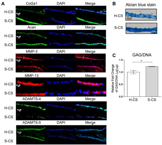Microscopic images of histological section. Image of heterogeneous chondrocyte sheets (H-CS) and stratified chondrocyte sheets (S-CS). (A) Immunofluorescence staining for Col2a1, Acan, MMP-3, MMP-13, ADAMTS-4, and ADAMTS-5. (Scale bar = 50 μm) (B) Alcian blue stain of H-CS and S-CS. (C) Total glycosaminoglycan (GAG) content of H-CS and S-CS. (*, p < 0.05).