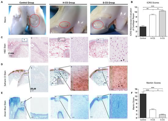 At twelve weeks after the implantation surgery, articular joint samples were harvested for gross and histological evaluation, which were based on the mean gross grading with respect to the defect coverage degree, neocartilage color, the integration of the border zone, and surface smoothness. The articular joint samples resulting from both the H-CS and S-CS showed improved regeneration of the osteochondral defects compared with the control group (Figure 6A). Overall, in the animals that were implanted with the S-CS, the defects were completely covered with the reparative tissue, whereas the osteochondral defects in the other two groups were only partially covered (Figure 6A). Additionally, in the group implanted with the S-CS, the boundaries between the implanted tissue and the native tissue were unclear and the newly formed tissue integrated almost completely with the adjacent normal tissues (Figure 6A). Further, the articular surfaces in the S-CS group appeared more intact and smoother and resembled normal articular tissue than those in the H-CS group (Figure 6A). Quantitatively, the ICRS macroscopic scores corresponding to the H-CS (9 ± 0.3) and the S-CS (10.5 ± 0.1) were markedly higher than those corresponding to the control (4 ± 0.5) (Figure 6B). To observe the differences between the cellular structures and matrix compositions resulting from the two implantation groups, microscopic histological examinations were performed using HE, Safranin-O, and Alcian blue staining (Figure 6C–E). The defects in the control group were characterized by reduced cellular distribution, surrounded by loose connective tissue resembling fibrous tissue, and showed very weak staining for Alcian blue and Safranin-O. Compared with the control groups, the defects implanted with H-CS showed a more even distribution of the chondrocytes as well as increased Alcian blue and Safranin-O staining intensity. Meanwhile, in the S-CS groups, the neocartilage displayed a zonal structure that closely resembled that of the native cartilage; the cells were densely distributed in the SZ and their PG content (stained with Safranin-O) was lower. In the MZ of this stratified sheet, an increase in the PG content with depth was observed, and the chondrocytes appeared rounded and more sparsely populated than those in the SZ. Moreover, lacunae were clear (Figure 6D and Supplementary Figure S2). Further, in the DZ, the chondrocytes were arranged in columns and exhibited cartilage-specific lacunae (Supplementary Figure S2). In sum, the S-CS group demonstrated the strongest Alcian blue and Safranin-O staining intensities. Finally, using the Mankin histological scoring system [35], a relative-quantitative evaluation was performed to determine the quality of the regenerated cartilage tissues. The scores obtained for the control, H-CS, and S-CS groups were 13.2, 4.3, and 1.8, respectively. This evaluation revealed a significantly improved histological score for the S-CS group compared with those in the other two groups (Figure 6F).