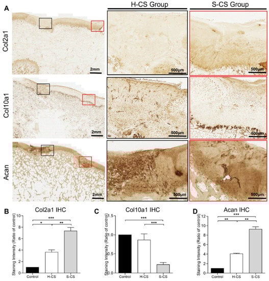 To further characterize the composition of the neocartilage, it was necessary to distinguish between the mature cartilage and hypertrophic cartilage. Thus, we performed immunohistochemistry for Col2a1, Acan, and Col10a1 proteins. As shown in Figure 7, neocartilage corresponding to the H-CS and S-CS groups showed positive results for Col2a1 and Acan staining, while the control group showed no staining. Additionally, Col2a1 was expressed in the ECM of the regenerated tissues within the defect, whereas Acan was localized both intracellularly and within the ECM. Like the integrated optical density (IOD) measurement results, the S-CS group presented stronger Col2a1 and Acan staining than the H-CS group (Figure 7A,B,D). Conversely, the neocartilage resulting from the H-CS showed stronger staining for Col10a1 (Figure 7A,C) than that resulting from the S-CS, indicating that the neocartilage of the S-CS group resembled the hyaline cartilage, as evidenced by the abundant deposition of PG and Col2a1 and the scarcity of Col10a1.