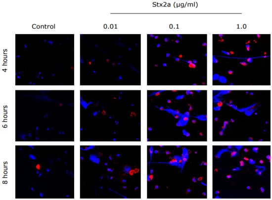 To determine the effect of Stx2 on neutrophil activation and NET formation, we isolated neutrophils from healthy controls, incubated the cells with Stx2a and measured neutrophil activation marker CD11b. Image analyses showed that Stx2a directly upregulated the expression of CD11b on the cell surface of neutrophils in a concentration-dependent manner. CD11b was also diffusely stained in the cytosol of neutrophils. Images not only showed more immunofluorescence of CD11b (red), but also show a denser nucleus with DNA strings (blue) (Figure 1), which indicates cell activation or death [21]. The release of DNA was studied with the use of a SYTOX green assay. SYTOX green is a cell impermeable nucleic acid stain that binds DNA rapidly and with high affinity [22]. Neutrophils from healthy donors were incubated with different concentrations of Stx2a and the release of DNA was measured over a time period of 8 h. As shown in Figure 2, neutrophils released DNA after incubation with Stx2a in a time-dependent manner. A large amount of DNA release was observed when neutrophils were incubated with 0.1 µg/mL and 1.0 µg/mL of Stx2a, while this release was not significant compared to that of controls with 0.01 µg/mL Stx2a. These results show that Stx2a upregulates CD11b and induces NET formation in healthy human neutrophils, in a concentration-dependent manner.