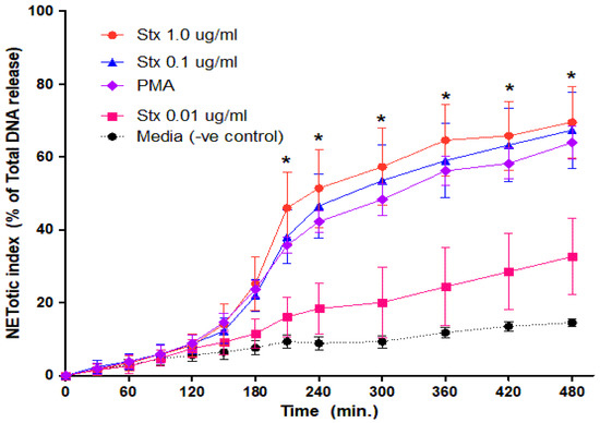 Dose-dependent NETs release response in neutrophils treated with Stx2a. Healthy control neutrophils were treated with different dosages of Stx2a, PMA, media (−ve control) and Triton (+ve control) and fluorescence reading was recorded up to 480 min. A dose-dependent effect was seen between Stx2a concentrations 0.01 µg/mL and 0.1 µg/mL, but not between 0.1 and 1.0 µg/mL of Stx2a. All significant differences were noted in conditions including 1.0 µg/mL, 0.1 µg/mL and PMA to media (−ve control) at indicated time points by a Mixed Models statistical test (* p < 0.05, n = 5).
