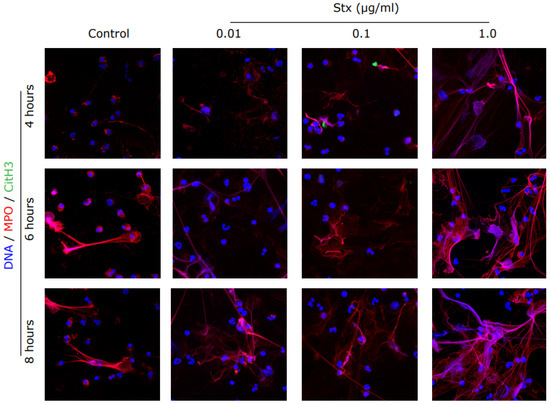To confirm the NET formation suggested by the SYTOX green assay, we immunostained and imaged the specimen. NETs not only consist of DNA, but also contain histones and granular proteins [23]. NETs should become visible as extra-cellular web-like structures positive for DNA in combination with one of its specific markers like CitH3 or MPO [23]. The presence of specific markers also depends on the pathways involved [17,24]. As shown by the images, neutrophils release NETs after stimulation with Stx2a (Figure 3). Images show the presence of DNA (blue) and MPO (red), while CitH3 (green) does not seem to be present (Figure 3; Supplementary Figure S1). MPO is a granular protein but coats the nuclear content and is subsequently released during NETosis. Microscopy showed that MPO (red) was located on the DNA strands (blue), as expected for NETs (Figure 3). CitH3 is mainly released after activation of neutrophils via the NOX-independent calcium-dependent pathway [17]; images with very little CitH3 staining suggest that NETs are released via the NOX-dependent pathway. Some NET are visible in media conditions after 6 and 8 h, which is expected to occur via spontaneous NETosis. Therefore, Stx2a dose-dependently induces NET formation in healthy human neutrophils.