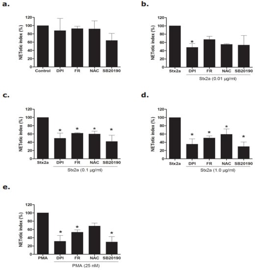 To confirm the pathways involved in Stx2a-induced NETosis, we used inhibitors specific for the various pathways involved in NETosis. Diphenyleneiodonium (DPI), a direct inhibitor of NOX [25], significantly inhibited Stx2a-induced NETosis at a concentration of 20 µM at all respective concentrations of Stx2a (Figure 4a–d; Supplementary Figures S2 and S3). This is consistent with the results that DPI significantly inhibits NOX-dependent NETosis of neutrophils induced by PMA (25 nM) (Figure 4e). With PMA being a generally accepted NOX-dependent agonist of NETosis, these findings suggest a pivotal role of NOX in Stx2a-induced NETosis. By contrast, ERK inhibition via FR180204 (20 µM), p38 inhibition via SB20190 (2.0 µM) or mitigated ROS signal transduction via N-acetylcysteine (NAC) (5 mM) were not able to significantly inhibit Stx2a-induced NETosis at the lowest concentration of Stx2a at 240 min (Figure 4b and Figure S3b), with significant inhibition occurring only at higher doses of Stx2a by 180 min (Figure 4c,d). These inhibitor studies show that Stx2a induces NETosis via the NOX-dependent pathway in a dose-dependent manner.