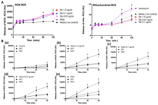 Stx2a induces NOX-ROS generation. Release of NOX-ROS and mitochondrial-ROS was measured by using DHR123, and MitoSox respectively. PMA and ionomycin were used as +ve control. (A) Data shows the involvement of NOX-ROS in Stx2a treated cells but not of mitochondrial ROS, there only +ve control (ionomycin) showed mitochondrial ROS generation (B) NOX-ROS release was measured along with DPI—a NOX-specific inhibitor, or NAC—a ROS scavenger. Untreated neutrophils (a) treated with 1.0–0.01 µg/mL of Stx2a (b–d) or 25 nM of PMA (e) with inhibitors over a time period of 90 min showed NOX-ROS generation. Significant differences were determined by a Mixed Models statistical test (p < 0.05). Significant differences were noted in conditions with their media control at respective time points (* p < 0.05 Stx2a compared to inhibitors DPI and NAC at respective time points, n = 4).