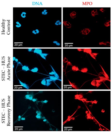 Spontaneous NETosis of neutrophils derived from patients with STEC-HUS. Immunostained images after 4 h of incubation show spontaneous release of NETs by neutrophils derived from patients in acute and recovery phase of disease, while this effect is not seen in healthy control neutrophils. Web-like structures representing NETs are positively stained for DNA (blue) and MPO (red). 63× magnification, n = 3 and scale bar 20 µm.