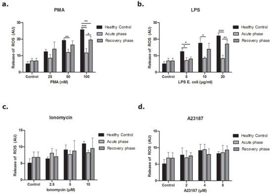 Neutrophils were incubated with different concentrations of PMA and LPS to stimulate the NOX-dependent pathway and different concentrations of ionomycin and A23187 to study the NOX-independent pathway [13,28,29]. As shown in Figure 7, neutrophils in the acute phase of disease released less DNA after stimulation of the NOX-dependent pathway (Figure 7a,b). The same pattern was observed when the NOX-independent pathway was activated, but to a lesser extent (Figure 7c,d). The release of NETs during the recovery phase of disease was re-established for both the NOX-dependent and the NOX-independent pathway.