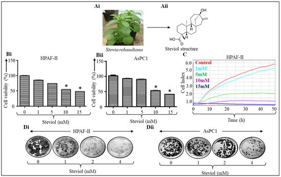 Steviol inhibits cell proliferation and clonogenic potential of pancreatic cancer cells. (Ai) A Stevia rebaudiana plant (www.wikipedia.com; accessed on 7 September 2021); (Aii) chemical structure of steviol; (B) pancreatic cancer cells were treated with different concentrations of steviol (0, 1, 5, 10, and 15 mM) and incubated for 48 h. Cell proliferation assay was terminated after addition of MTT reagent and recording the absorbance in HPAF-II (Bi) and AsPC1 cells (Bii); n = 3; * p < 0.05. (C) The cells were subjected to the xCELLigence instrument and cell proliferation assay (0, 1, 5, 10, and 15 mM of steviol) was conducted on the E-plate; (D) colony formation assay was performed on pancreatic cancer cells HPAF-II (Di) and AsPC1 (Dii). The cells were seeded, and after 4 days, treatment with steviol was performed at different concentrations (0, 1, 2, and 4 mM), and the cells were incubated for another 10 days.