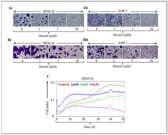 Pancreatic cancer cells were treated with steviol at various concentrations, and it was observed that steviol efficiently inhibited the cell invasion (Figure 2Ai-ii) and cell migration (Figure 2Bi-ii) abilities in a dose-dependent manner. Moreover, the suppression of migration in HPAF-II cells was evaluated by xCELLigence assay after treatment with steviol. This also demonstrated that steviol is effective in repressing the cell invasion and migratory potential of pancreatic cancer cells (Figure 2C).