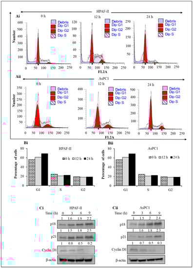 Regulation of the cell cycle is an important mechanism of many drugs. Therefore, to investigate the effect of steviol on cell-cycle regulation, pancreatic cancer cells were treated with steviol for different time points (0, 12, and 24 h) for cell-cycle analyses. It was observed that steviol induced G1 arrest, as depicted through the histogram graphs. The quantitative G1 population with respect to time is represented in HPAF-II and AsPC1 cells (Figure 3A,B). The proportion of G1 cells increased by about 27% in HPAF-II cells, and around 18% in AsPC1 cells after 24 h of steviol treatment. Furthermore, to understand the underlying mechanism of the G1 phase arrest, the regulatory proteins that are associated with the G1 stage of cell cycle were evaluated to determine if steviol induced any inhibitory effects on them. Interestingly, the immunoblotting results demonstrated that the inhibitory proteins associated with cell cycle, mainly p 18 and p 21, were significantly increased upon steviol treatment. On the other hand, Cyclin D1, which is critically involved in the progression of cell cycle [33], was remarkably downregulated in the presence of steviol in comparison to the untreated/control cells. These observations suggest that steviol treatment can regulate the cell cycle via the modulation of cycle-associated proteins (Figure 3Ci,ii).