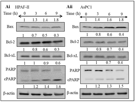 Apoptosis is commonly referred to as programmed cell death; cancer cells typically evade this process very effectively for acquiring uncontrolled proliferation and growth [34]. Several proteins are associated with the apoptotic pathway. Bax is one of the pro-apoptotic proteins crucially involved in this pathway. Moreover, other proteins such as Bcl-2, PARP, and Bcl-xL are the significant anti-apoptotic proteins regulating these processes [35]. It was interesting to evaluate whether steviol can modulate the apoptosis in pancreatic cancer cells. Therefore, the expression of apoptotic proteins was examined in pancreatic cancer cells after the treatment with steviol in a time-dependent manner (0, 3, 6, and 9 h). It was observed that the expression of Bax protein (pro-apoptotic) was upregulated in both HPAF-II and AsPC1 cell lines while the expression of important anti-apoptotic proteins (Bcl-2 and Bcl-xL) decreased significantly in a dose-dependent manner. In addition, increased PARP cleavage (a marker for early apoptosis) was observed after the treatment with steviol. These results collectively indicated that steviol facilitates the apoptosis process in pancreatic cancer cells (Figure 4Ai,ii).