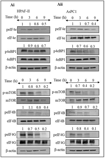 Disruption in the translation initiation machinery directly relates to carcinogenesis, and various oncogenic molecules and tumor suppressors play a major role in this process [36]. Therefore, it was imperative to understand the mechanism of action of steviol in relation to the translation initiation pathways. The expression of proteins associated with translation was analyzed, after the treatment of pancreatic cancer cells with steviol at different time intervals. Interestingly, we observed a remarkable inhibitory effect of steviol on the expression of proteins (peIF4E, peIF4B, peIF4G, p4EBP1, and p-mTOR) that are involved in the process of translation initiation (Figure 5Ai,ii). These proteins are required for the proper functioning of the translation initiation process. Steviol treatment clearly inhibited the expression of these essential proteins, which in turn hampered the formation of new proteins. It has been documented that activation of eIF4E increases the key tumorigenic mRNAs translation in order to enhance oncogenic characteristics [37], and steviol effectively decreased its phosphorylation. This suggest that steviol might delay the translation initiation process, which in turn reduces the tumorigenic activity of pancreatic cancer cells.