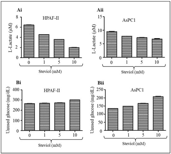 Pancreatic cancer cells consume a very high level of glucose, which is metabolized by the glycolysis pathway, and produce lactate as the final product of glucose metabolism [27,38]. Therefore, we investigated if steviol could lower the glucose uptake and lactate production in pancreatic cancer cells. Indeed, steviol decreased lactate secretion in both HPAF-II (control vs. steviol 10 mM: 6.45 ± 0.05 µM vs. 2.01 ± 0.08 µM) and AsPC1 (9.49 ± 0.18 µM vs. 6.78 ± 0.26 µM) cell lines (Figure 6Ai-ii). Moreover, tumor cells undergo altered metabolism to support and sustain their upregulated growth and proliferative capabilities [27,38]. Studies have reported the potent anti-glycemic activity of steviol precursor in rats and humans [11,12]. Thus, we examined its effect on glucose uptake/total glucose levels in pancreatic cancer cells. Interestingly, it is observed that steviol treatment (10 mM) significantly (p < 0.05) reduced glucose uptake/consumption in pancreatic cancer cells (HPAF-II: 266.51 ± 1.0 mg/dL vs. 301.69 ± 1.65 mg/dL; and AsPC1: 134.21 ± 1.57 mg/dL vs. 207.14 ± 4.24 mg/dL) as compared to untreated control cells (Figure 6Bi-ii). These findings clearly suggest that steviol can be a useful compound to lower glucose metabolism and lactate production in pancreatic cancer cells.